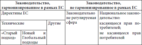 В табл. 1 приведена общая структура охвата объектов технического регулирования законодательством разных уровней: общеевропейским и национальным. Эта структура регламентируется постановлением Европейского совета 85/374/ЕЭС «О сближении законов, инструкций и положений государств-членов об ответственности за недоброкачественную продукцию» и Директивой Европейского парламента и Европейского совета 2001/95/ЕС «Об общей безопасности продукции».