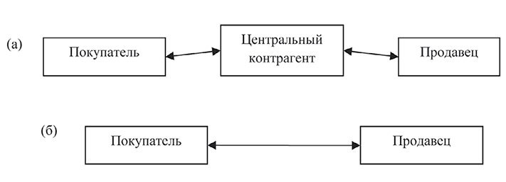 Работу центрального контрагента можно представить на примере уже рассмотренного механизма клиринга и связанного с ним неттинга, который может проводиться (а) с участием центрального контрагента в качестве стороны в обязательствах по сделкам и (б) без такового участия.