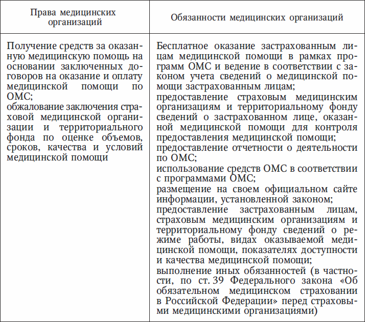 Таблица 3. Права и обязанности медицинских организаций (ст. 20, 39 Федерального закона «Об обязательном медицинском страховании в Российской Федерации»)