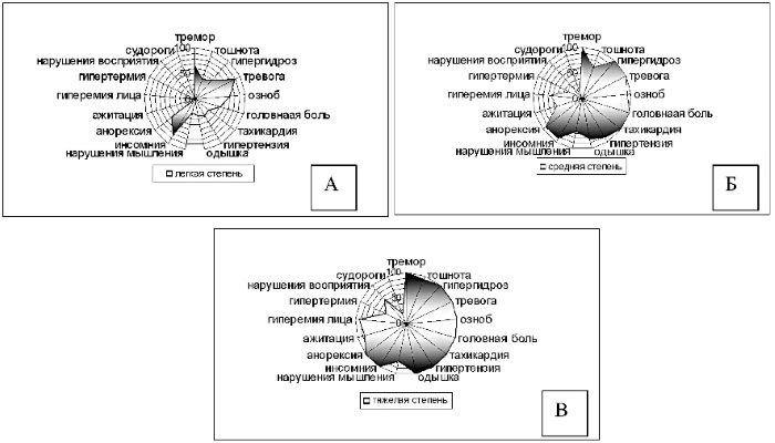 А – легкая степень ААС, площадь под кривой, образованной показателями шкалы CIWA-A, составляет 11 209 (у.е.); Б – средняя степень тяжести ААС, площадь под кривой, образованной показателями шкалы CIWA-A, составляет 37 056 (у.е.); В – тяжелая степень ААС, площадь под кривой, образованной показателями шкалы CIWA-A, составляет 47 123 (у.е.). Измерение площадей производится автоматически в программе Exell.