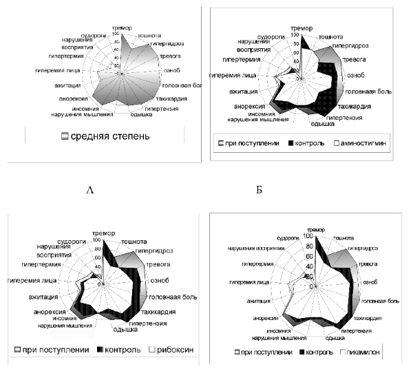 Рис. 12. Сравнительная активность лечебного действия аминостигмина (Б), рибоксина (В) и пикамилона (Г) по сравнению друг с другом и контрольной группой (А), по степени редукции психосоматического «профиля» больных с ААС в первые сутки лечения(Обсчет показателей шкалы CIWA-A в Exell; по: Комаров И. В., 2000)
