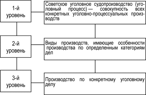 Следовательно, советский уголовный процесс, или уголовное судопроизводство, можно подразделить по «вертикали» – на виды уголовных судопроизводств и по «горизонтали» – на уголовно-процессуальные этапы, стадии. Разумеется, этими аспектами не ограничивается представление о структуре уголовного процесса. Как уже отмечалось, вид уголовного судопроизводства включает в себя совокупность производств по конкретным делам. В свою очередь, производство по каждому конкретному делу представляет собой также систему, состоящую из определенных элементов, и т. д.