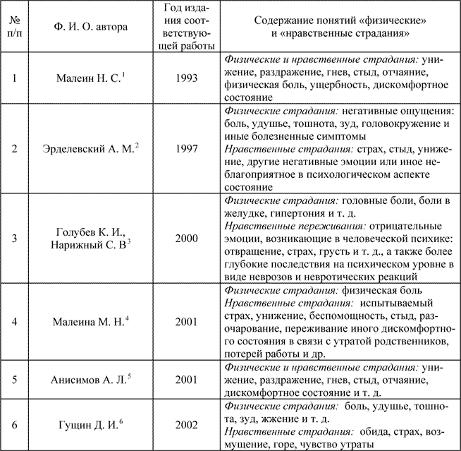 В современной правоведческой литературе в основном сложилось единое понимание того, что должно входить в содержание понятия «физические и нравственные страдания». Проиллюстрируем это на примерах, для наглядности представив требуемую информацию в форме таблицы (см. табл. 1).
