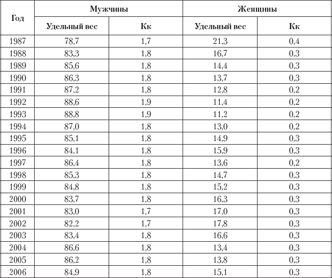 Удельный вес (%) и коэффициент криминальной активности (Кк) мужчин и женщин в России (1987–2006)