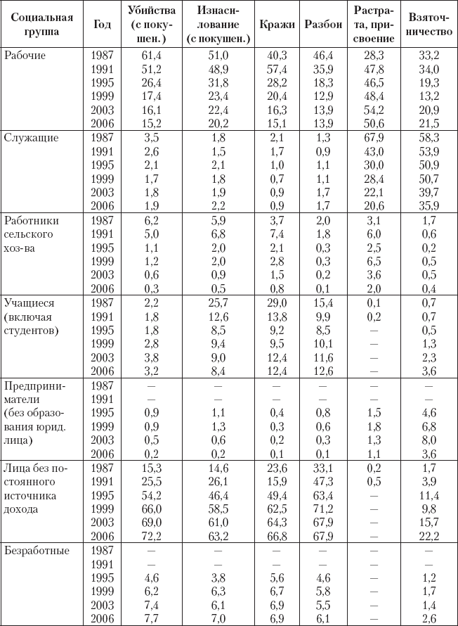 Приводя в качестве примера распределение различных преступлений по социальным группам (табл. 4.3), мы вынуждены исходить из группировки, принятой в милицейской статистике.