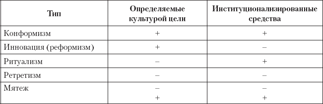Культура каждого конкретного общества определяет его цели и легальные, институционализированные средства их достижения. В зависимости от принятия (+) или непринятия, отрицания (—) целей и средств существует пять теоретически возможных типов поведения (путей приспособления индивидов к социальным условиям), которые Мертон представляет в виде таблицы (5.1).