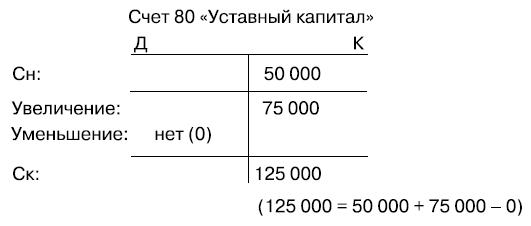 Например, в организации уставной капитал на начало периода составлял 50 000 руб. Принято решение об увеличении уставного капитала на 75 000 руб.