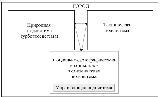 Город, занимающий определенную часть земной поверхности, включает популяцию человека с высоким показателем плотности, производственный комплекс, инфраструктуру и специфическую природную, искусственную и социально-культурную среду обитания, представляет собой урбогеосоциосистему (рис. 1.3). Социальный блок в такой системе выполняет системообразующую и управляющую функции.