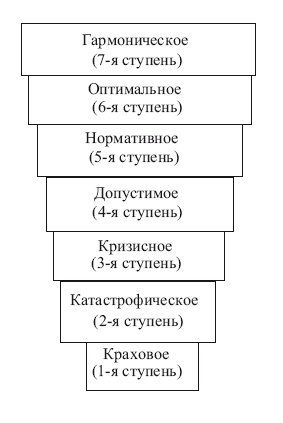 Для определения балльного показателя выделяют семь ступеней экологического состояния городской среды, каждая из которых характеризуется определенной суммой баллов. Все ступени образуют экологическую пирамиду состояния городской среды (рис. 1.9).
