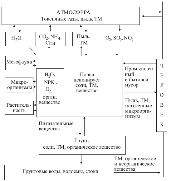 На рис. 2.2 представлена роль почвы в городских экосистемах, а также пути поступления загрязняющих веществ в почвы городов.