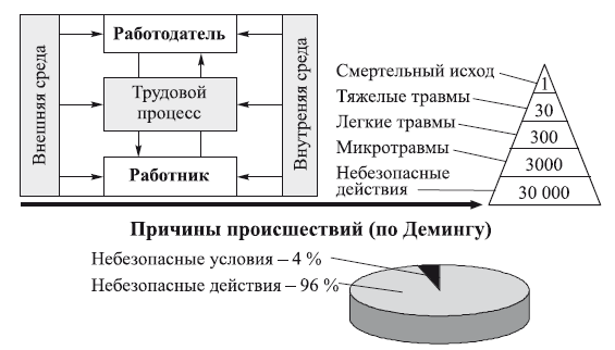 Таким образом, производственный процесс выступает в качестве передаточного звена между внешними и внутренними условиями, в которых осуществляется трудовая деятельность, и зависит как от мер законодательного и административного характера по охране труда, осуществляемого работодателем, так и от самого работника (рис. 1.1).