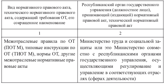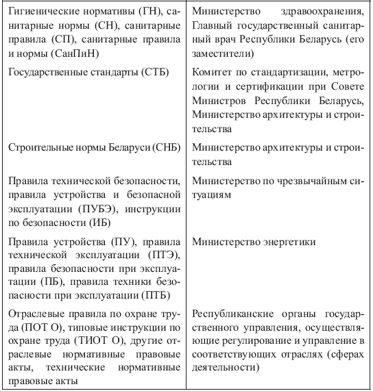 В соответствии с постановлением Совета Министров Республики Беларусь от 10 февраля 2001 г. № 150 система нормативных правовых актов, технических нормативных правовых актов, содержащих требования ОТ, состоит из межотраслевых и отраслевых правил по ОТ, типовых инструкций по ОТ, норм ОТ, санитарных норм, правил и гигиенических нормативов, государственных стандартов, строительных норм, правил технической безопасности, правил устройства и безопасной эксплуатации, других нормативных правовых актов, технических нормативных правовых актов (табл. 1.2).