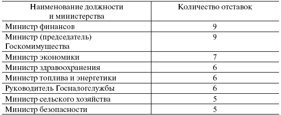 В современной России продолжается поиск оптимальной системы государственного управления, осуществляемый во всех ветвях власти, в том числе и в исполнительной ветви власти. Наиболее интенсивным и крайне непоследовательным он был в период с 1991 по 1999 г. Отчаянная экономическая и политическая ситуация в стране влекли за собой череду не всегда логически понятных регулярных отставок руководителей федеральных министерств и ведомств. Об этом наглядно свидетельствует табл. 6.1[142].