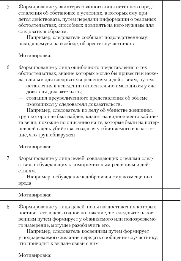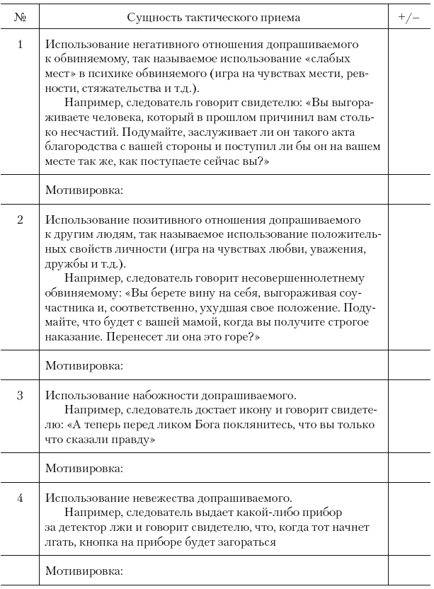 Заполните таблицу, отразив с правой стороны допустимость (недопустимость) примененного тактического приема, указав соответственно значок «+» или «—», а также в графе «мотивировка» – признаки (критерии), которыми вы руководствовались, принимая соответствующее решение.