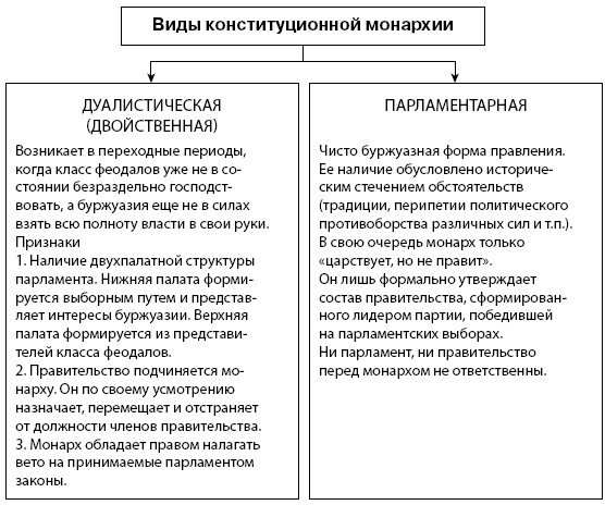 Как для абсолютной, так и для дуалистической монархии типичен авторитарный политический режим. А сама дуалистическая монархия есть выражение компромисса между властвующей феодальной верхушкой общества и остальной его частью, основу которой составляет монарх и его окружение.