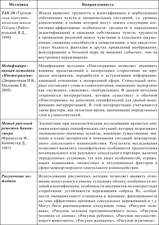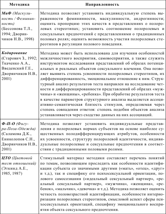 Комплексное применение батареи методик позволяет не только объективизировать и верифицировать данные сексологического исследования, но и раскрыть целый пласт психологических феноменов, имеющих отношение к психосексуальной сфере: особенности полового самосознания, особенности восприятия сексуального партнера, установки по отношению к сексуальному партнеру и т. д.