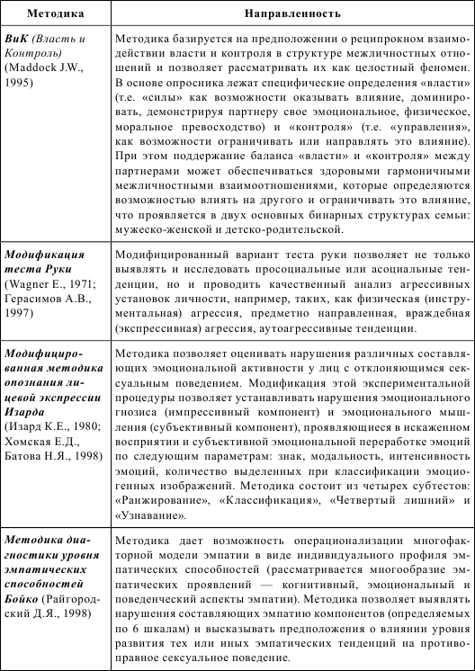 Опыт работы в лаборатории судебной сексологии в период с 1994 г. и по настоящее время позволяет выделить следующие психологические методики, положительно зарекомендовавшие себя при решении различных экспертно-диагностических задач в судебной сексологии (табл.).