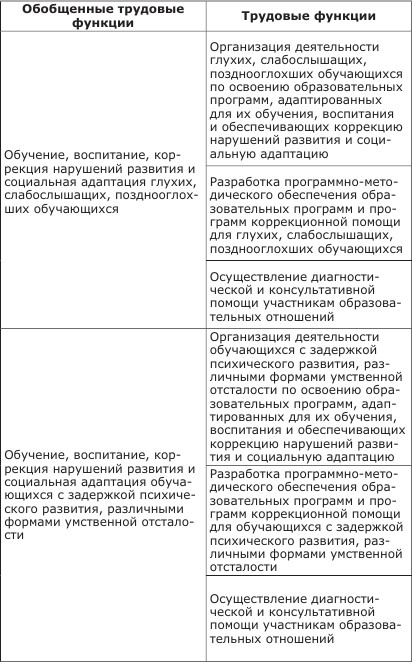 К каждой специальности была разработана соответствующая квалификационная характеристика. Однако в Номенклатуре должностей педагогических работников организаций, осуществляющих образовательную деятельность, должностей руководителей образовательных организаций (постановление Правительства Российской Федерации от 08.08.2013 № 678) до настоящего времени сохранились лишь два наименования: «учитель-дефектолог» и «учитель-логопед (логопед)»; в отдельную категорию оказался выделенным только учитель-логопед, в то время как специалисты с квалификациями «сурдопедагог», «олигофренопедагог», «тифлопедагог» были объединены под названием «учитель-дефектолог».
