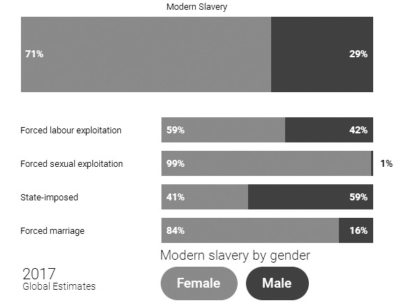 Посмотрим на цифры. По данным исследования Global Estimates of Modern Slavery, подготовленного Walk Free Foundation совместно с другими организациями в 2017 году, 40 миллионов человек по всему миру находятся в рабстве, на них зарабатывают до 32 миллиардов долларов ежегодно. Из этих 40 миллионов лишь 5 миллионов рабов (99% случаев – женщины) задействованы в секс-индустрии.5859