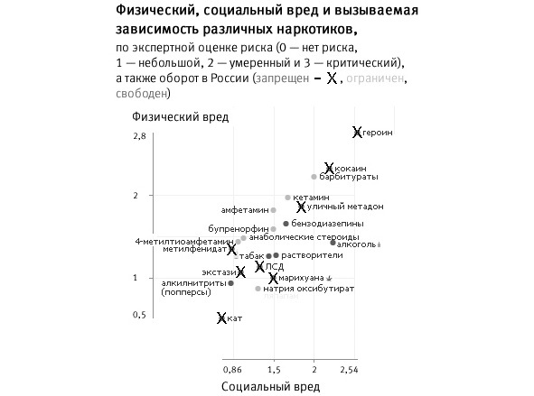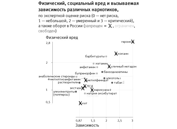 И это при том, что незаконные марихуана или ЛСД обладают меньшим общественным вредом, чем алкоголь. Привыкание (зависимость) к экстази или галлюциногенам развивается в меньшей степени, чем к табаку или алкоголю.