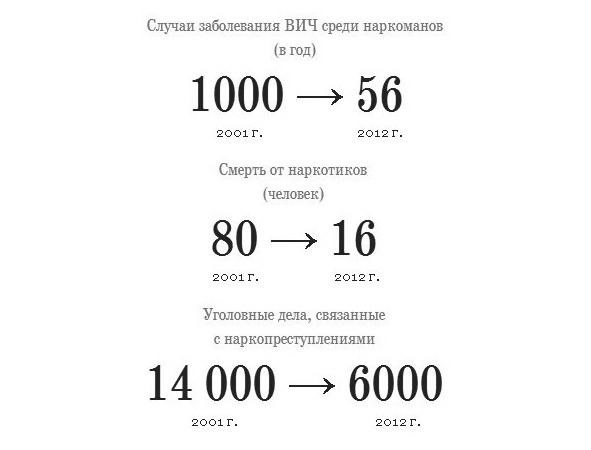 Эти меры, не смотря мягкость и нетрадиционность, позволили добиться того, чего не удавалось добиться жесткими полицейскими методами в течение многих лет. А именно: снижения количества наркозависимых, увеличения количества обращений к наркологам за медицинской помощью, увеличения количества отказов от наркотиков, уменьшения количества «впервые попробовавших», снижения смертности от передозировки, снижения заболеваемости СПИДом, гепатитами, туберкулезом.