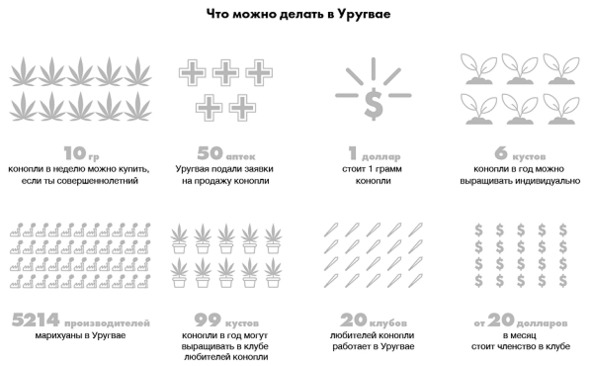 Ради борьбы с наркобизнесом, коноплю в Уругвае решили продавать дешевле, чем у дилеров, – по одному доллару за грамм. Для сравнения: в России и многих странах Европы стоимость одного грамма на нелегальном рынке начинается от 10—15 долларов.123