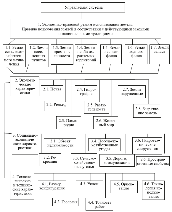 Управление земельными ресурсами носит двусторонний характер, поэтому в целях практического анализа их параметры следует условно разбить на нормативно-правовые, экологические, социально-экономические, технологические и технические (см. рис. 1.3).