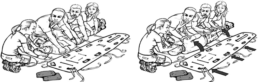 – постраждалого іммобілізують на жорстку поверхню, з підтримкою шиї і хребта в одній площині одночасно, щоб запобігти скручуванню або вигину;
