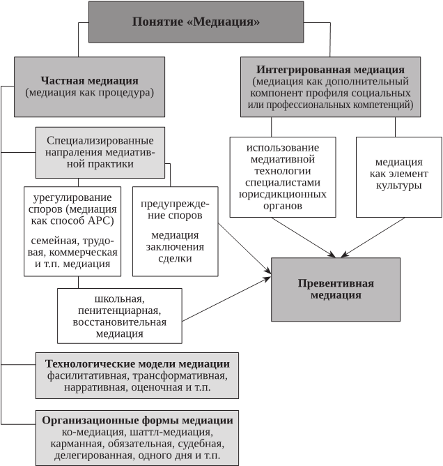Указанное свидетельствует о необходимости систематизации представленных в литературе «видов», «моделей», «разновидностей», «типов», «стилей», «направлений», «концепций», «технологий», «вариантов» медиации в целях: