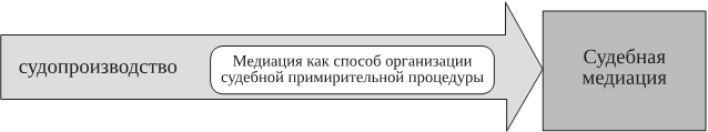 В первом случае речь идет о частной медиации как об обособленной примирительной процедуре, возможность применения которой заинтересованными лицами предусмотрена законодательством после возбуждения дела в государственном суде или в рамках производства в ином юрисдикционном органе (например, в третейском суде). Результаты интеграции медиации как процедуры в деятельность государственного суда находят отражение в терминах «медиация, прикрепленная к суду», «судебная (внутрисудебная) медиация», «делегированная медиация», «при-судебная медиация», обозначающих организационную форму проведения процедуры медиации после возбуждения дела в суде.