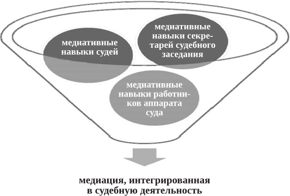 Помимо применения медиации как самостоятельной альтернативной процедуры урегулирования споров, подведомственных суду, актуальным направлением совершенствования правозащитного механизма выступает развитие у специалистов, задействованных в системе государственного судопроизводства, а также досудебного разрешения споров и сфере АРС, медиативных навыков как дополнительной составляющей их профиля профессиональных компетенций. В этом случае принято говорить о так называемой интегрированной модели медиации.