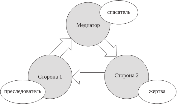 Дополнительным аргументом в пользу отказа медиатора от использования оценочной (директивной) и более жестких моделей медиации, принуждающих стороны к заключению медиативного соглашения, может служить анализ психологических взаимоотношений, которые складываются при этом между медиатором и сторонами, находящий свое выражение в известной теоретической модели психологического треугольника «жертва—спасатель—преследователь».