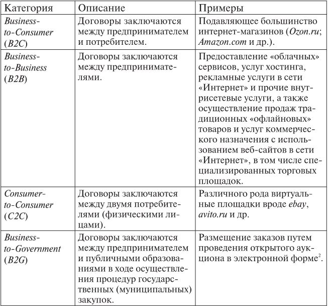В рамках данной работы будут рассмотрены вопросы, характерные для отношений, возникающих в сфере электронной коммерции в B2B– и B2C-секторах. C2C- и B2G-сегменты, по моему мнению, не обладают на данный момент существенной спецификой, которая бы оправдывала выделение их в отдельные категории для целей правового анализа. Основные проблемы, которые возникают в данных случаях, касаются стадии заключения договора, с учетом того, что большинство договоров в данных сегментах предполагают исполнение в офлайн-режиме. В связи с этим те проблемы и решения, которые характерны для B2B и B2C, будут вполне применимы и здесь. Не исключено, что по мере развития взаимодействия государства и бизнеса в сети «Интернет» потребуется детальный анализ правовых аспектов возникающих в связи с этим отношений.