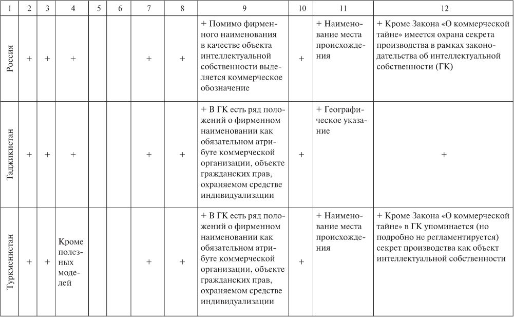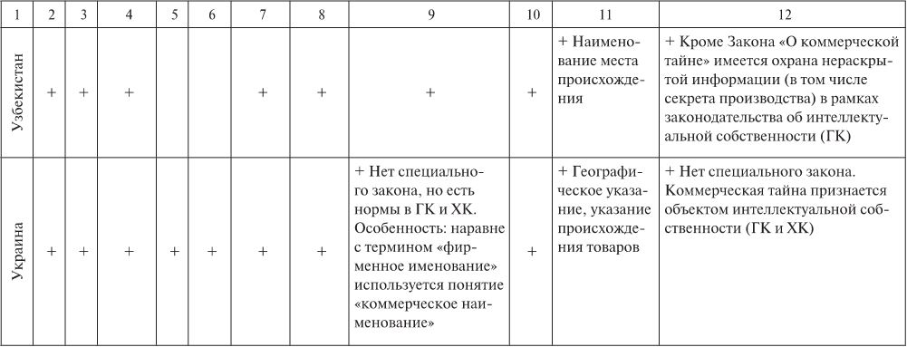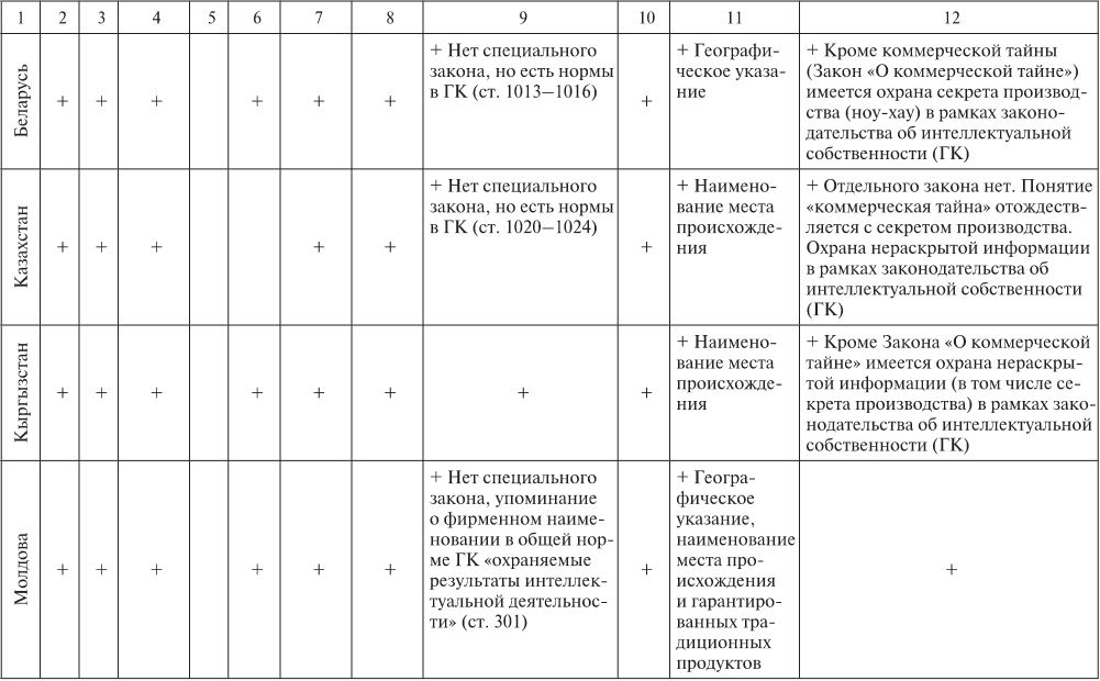 Для удобства читателей представляем сводную таблицу, в которой отображено наличие или отсутствие правовой охраны (с указанием выявленных особенностей) каждого из вышеприведенных объектов интеллектуальной собственности в государствах – участниках СНГ (Азербайджан, Армения, Беларусь, Казахстан, Кыргызстан, Молдова, Россия, Таджикистан, Туркменистан, Узбекистан, Украина).