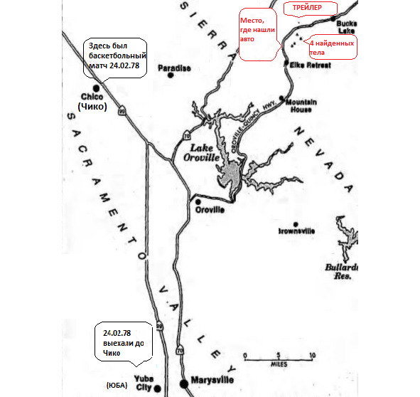 Карта места событий. Красными подсказками выделены место обнаружения автомобиля, трейлера и тел Джек Хютт, Уильям Стерлинг, Джек Мадруга и Теодор Вейхер.