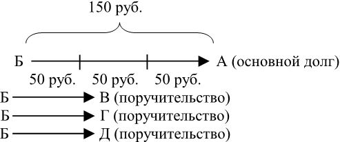 Очень интересный вопрос заключается в следующем: каким образом обеспечено обязательство должника А перед кредитором Б? Ведь основной долг на сумму 150 руб. можно представить обеспеченным не полностью, только в сумме 50 руб., но тремя поручительствами или следующим образом: