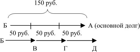 Например, представим, что в приведенном выше примере В, Г и Д установили, что каждый из них отвечает за должника, но не свыше 50 руб.