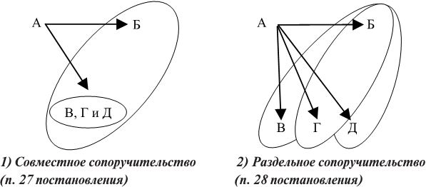 Графически разницу между конструкциями совместно данного со-поручительства и раздельного сопоручительства можно изобразить следующим образом: