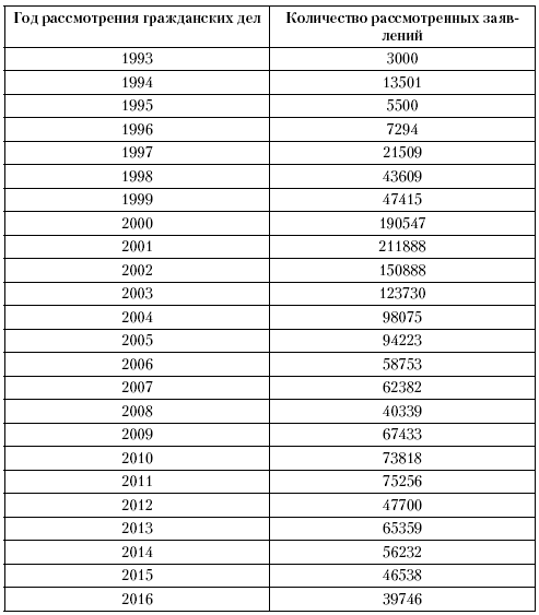 Динамику изменения количества рассмотренных военными судами заявлений военнослужащих, граждан, уволенных с военной службы, по годам характеризует следующая таблица {табл. 1):