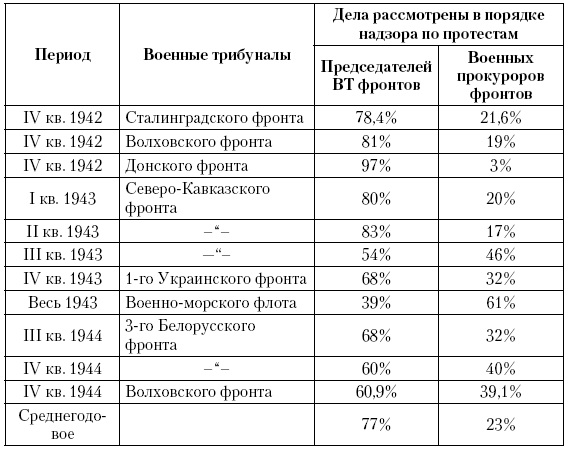 О масштабе работы военных трибуналов фронтов (флотов) по проверке приговоров в порядке надзора и устранению судебных ошибок, допускающихся нижестоящими военными трибуналами, свидетельствует тот факт, что опротестованию и пересмотру в надзорном производстве подвергалось 10–35 % всех рассмотренных дел. Из числа дел, рассмотренных в порядке надзора военным трибуналом Воронежского, а позднее и I Украинского фронта, прекращалось до 10, а в отдельные периоды, в частности во II и III кварталах 1943 г., – до 20 % дел в (лицах). [240]