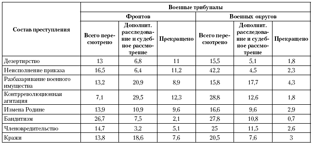 Анализ данных этой таблицы свидетельствует, что стабильность приговоров, пересмотренных военными трибуналами округов (вне районов боевых действий) в кассационном порядке, по всем категориям дел была выше, чем приговоров, отмененных в порядке надзора военными трибуналами фронтов. Бесспорно, этот факт объясняется условиями военного времени и действием военных трибуналов в боевой обстановке. Вместе с тем существенного расхождения в судебной практике военных трибуналов, действовавших в разных условиях, не усматривается.