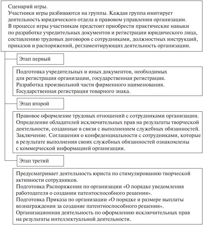 Игровая модель имитирует реальные условия функционирования юриста организации и предусматривает приобретение практических навыков в составлении трудовых договоров, учредительных документов и других локальных правовых актов, определяющих деятельность организации.