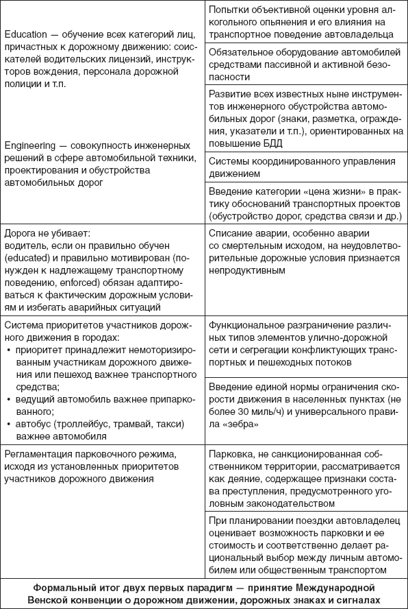 В рамках этой концепции, в частности, было признано непродуктивным отнесение аварий, особенно аварий со смертельным исходом, на сопутствующие неудовлетворительные дорожные условия. Речь здесь идет о том, что автовладелец в качестве налогоплательщика, избирателя, члена городского сообщества может и должен добиваться от властей всех уровней обеспечения нормальных, во всяком случае, безопасных дорожных условий. Однако тот же автовладелец в качестве водителя, правильно обученного (education) и правильно мотивированного (enforcement), обязан адаптироваться к фактическим дорожным условиям, т. е. выбирать режимы движения, позволяющие во всех случаях избегать аварий с тяжкими последствиями.