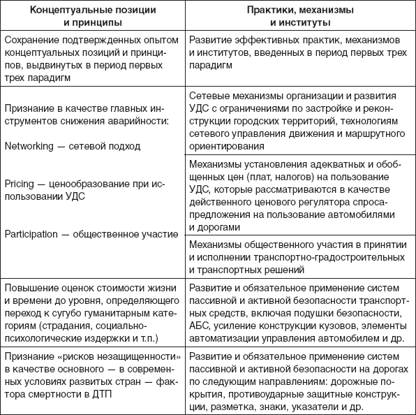 Система взглядов, подходов, практик в сфере БДД, в рамках которой с середины 1980-х годов продолжают самообучение страны с развитой автомобилизацией [OECD, 2004], определяет четвертую парадигму обеспечения БДД (см. табл. 5, 11). Период действия этой парадигмы в большинстве стран мира еще продолжается, хотя в целом сегодня уже можно определить некоторые формальные критерии ее завершения.