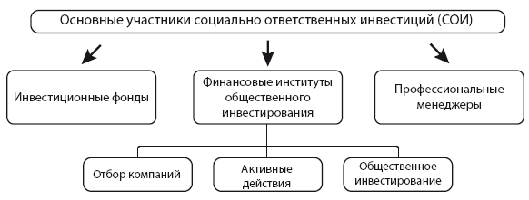 Первые фонды социально ответственных инвестиций (СОИ), или этические фонды, стали появляться в зарубежной практике в 70-80-х годах XX века и отличались тем, что не инвестировали в компании, получающие доходы от деятельности в странах военных действий, от продажи и распространения оружия, табачной, алкогольной продукции, а также использующие тяжелый детский труд. Этические фонды инвестировали преимущественно в компании, связанные со здравоохранением, образованием, производством товаров, улучшающих качество жизни. Количество фондов росло, появлялись другие участники рынка СОИ, расширялся перечень инструментов СОИ (банковские продукты, венчурные фонды). В настоящее время сегмент СОИ представлен на финансовых рынках почти во всех регионах мира: в Америке (США, Канаде, Бразилии), в Европе, в Австралии, в Азии [742].
