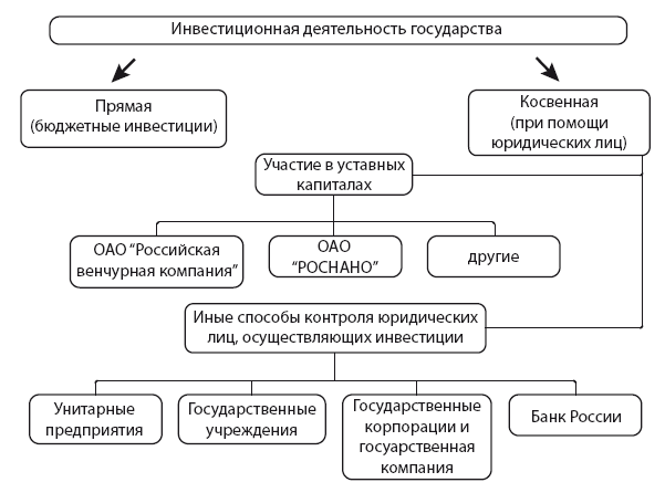 Вследствие особенностей действующего законодательства, регламентирующего правовой режим государственного имущества, участие государства в инвестиционной деятельности[770], как правило, осуществляется не напрямую, а косвенно, посредством специально создаваемых для этих целей юридических лиц [771].