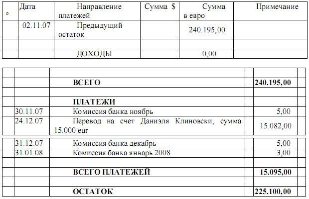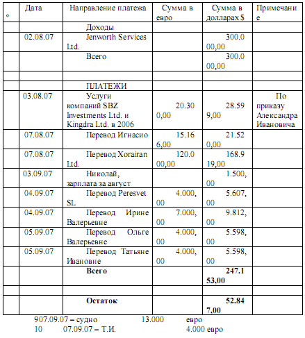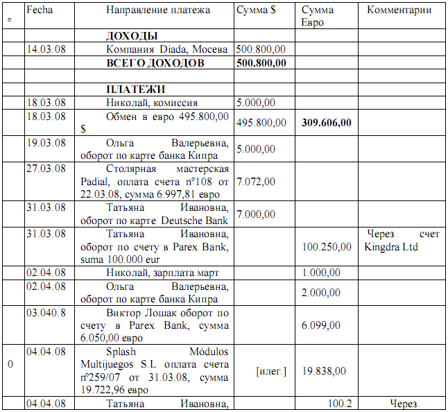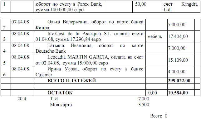"Ольга звонит "Егоровичу" и говорит, что деньги пришли из “KREPMARKET” из Москвы и нужно сделать: два перевода Ирине, завтра 4000 и на следующей неделе еще 4.000; 5000 пойдут в “PERESVET”; 5000 Татьяне "Ивановне”; 2000 на счет Ольги на Кипре. Что касается 20,000 долларов: 1500 "Егоровичу”, 3500 в немецкую компанию Александра; 5000 ЛОШАК и до 10000 на счет Александра в горах (Швейцария). Николай сказал, что в этом году используются не фунты, а доллары, и говорит , что Ольга имеет 9500 евро в "карта» и 5600 евро на счету; она говорит , что потеряла пин-код своей карты; Николай, говорит, что отправит код и предупреждает никому не говорить, после спрашивает, получили ли они новые карты, и она говорит, да, он объясняет, что не было MasterCard, а только Visa и она отвечает, что это не важно, потому что используется исключительно Visa»[25]