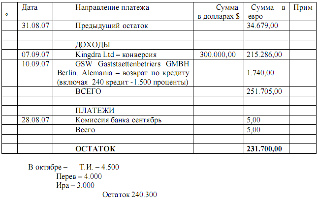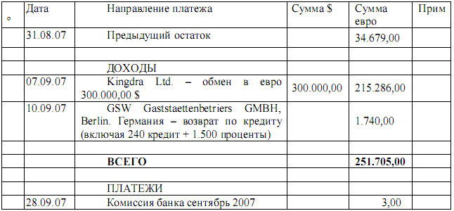 - “Kingdra Ltd.” получает “GSW Gaststaettenbetriers Gmbh Berlin ”, 10/09/2007 в сумме 1.740$, с назначением платежа: “Возврат кредита”.