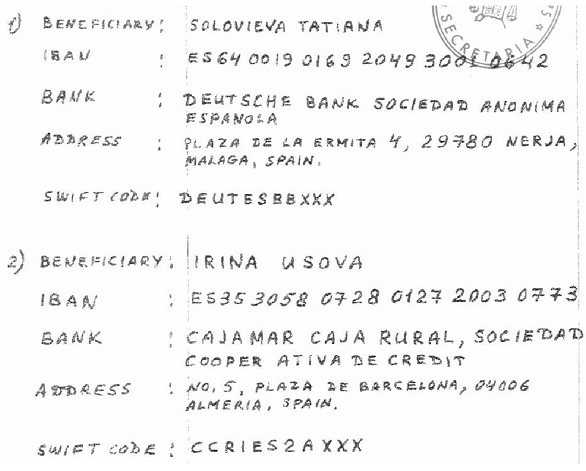 Через отправление факсов на Кипр и многочисленные телефонные звонки был продиктован порядок реализации этих переводов, в которых получателями были физические лица, действовавшие как подставные лица семьи Малышева, такие как обвиняемые Ирина Усова, Татьяна Соловьева, Леокадиа Мартин, сама Ольга Соловьева, и несколько юридических лиц, таких как “Peresvet S. L” и “Xorairan S.L”.