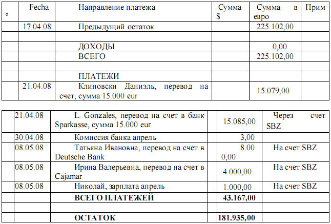 “Ольга звонит Николаю «Егоровичу» и спрашивает у него, идет ли он завтра, он отвечает ему, что рано утром. Ольга комментирует, что видела движения по счету и спрашивает, может ли он позвонить и сказать, чтобы сделали один перевод. «Егорович» отвечает, что он может делать это сегодня. Ольга отмечает, что нужно послать 6.000 долларов на счет "Лагнлас Гонсалес ” в Германию и другие 6.000 долларов на "Лошак ”, также в Германию. Николай говорит, что пошлет сегодня и они поступят в понедельник”.[24]